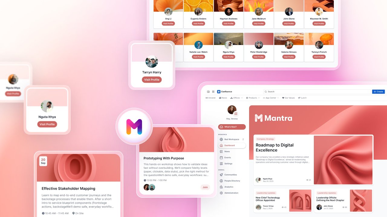 Mantra publishes targeted announcements, company news, and event updates directly inside Confluence. It adds a communication layer with audience targeting, structured channels, and engagement tracking — turning Confluence from a document repository into an active communication platform.